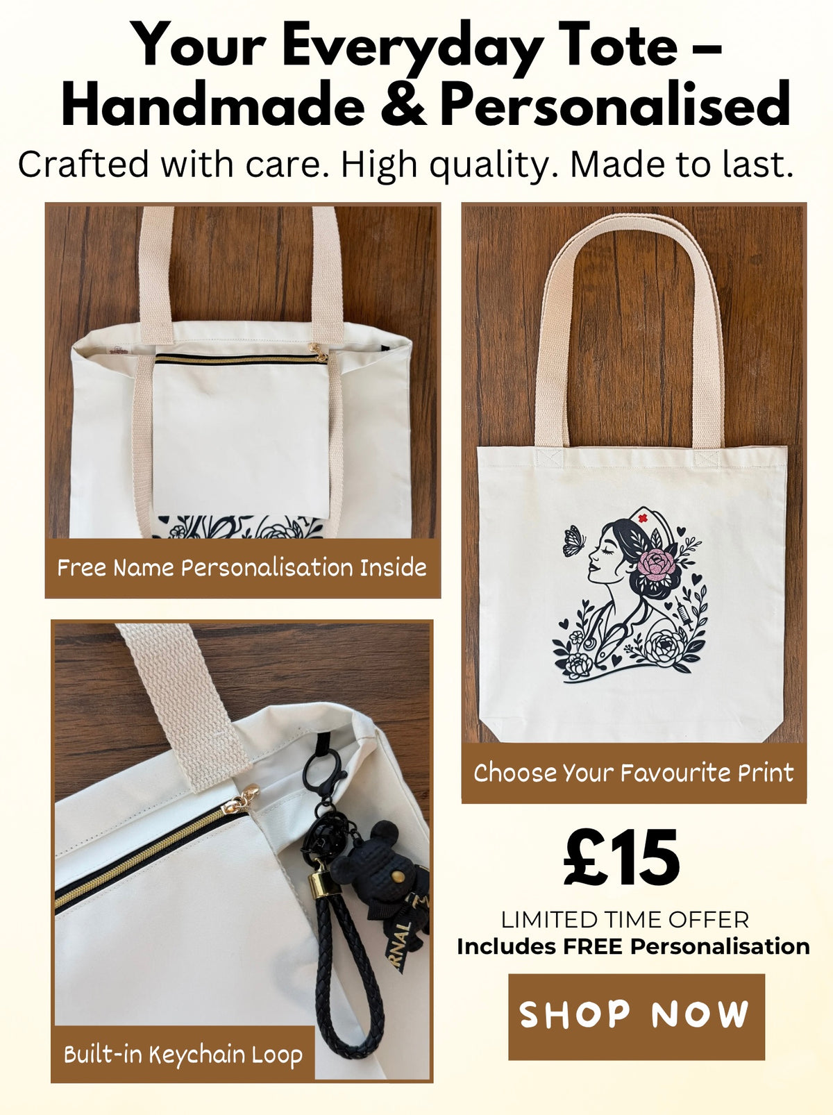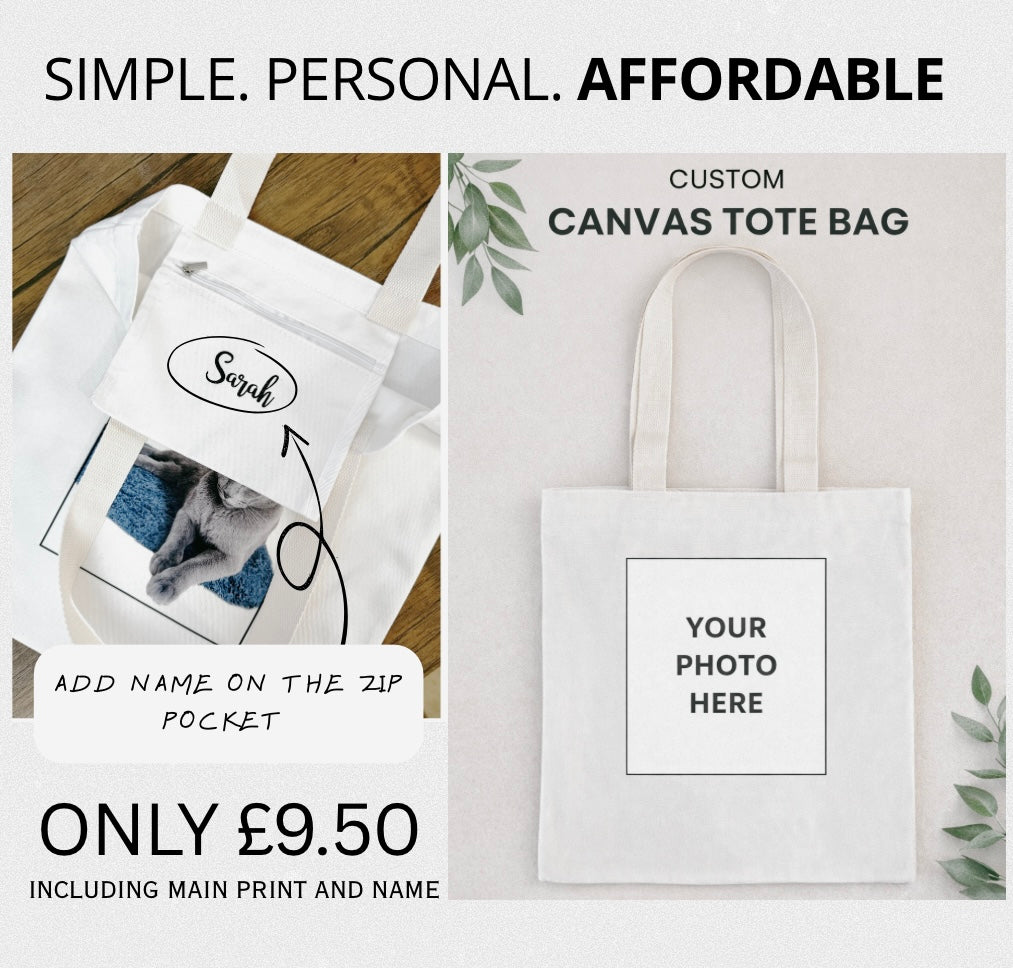 Personalised Handmade Tote Bag – Gift for Her, Custom Name, Secure Zip Pocket, High Quality Material